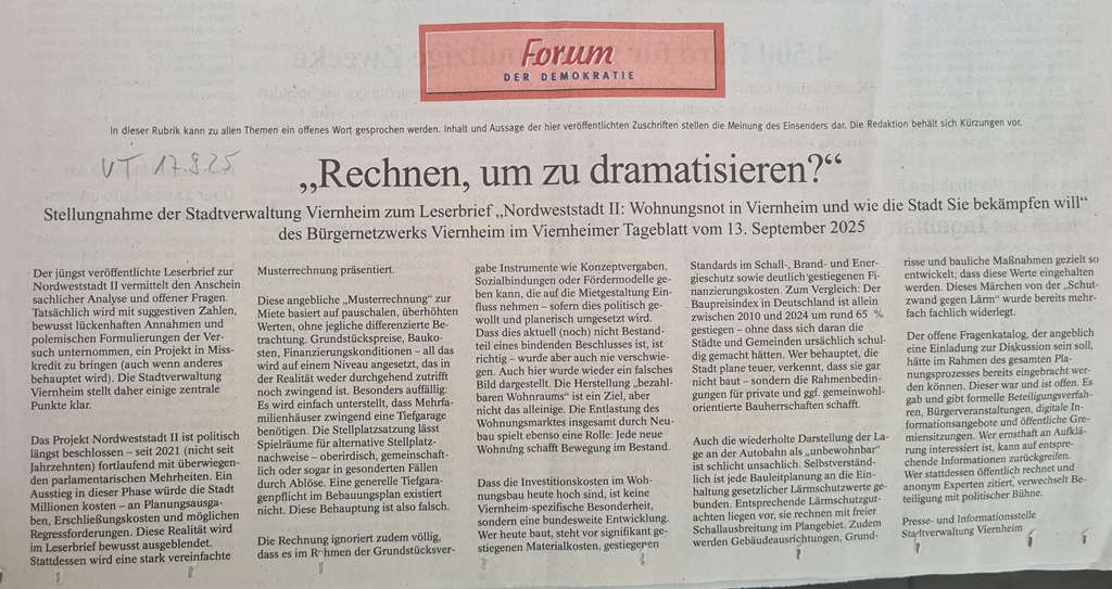 mit großer Verwunderung haben wir die Erwiderung der Pressestelle der Stadt Viernheim auf unsere Rechnung zu den wahrscheinlichen Miet- und Kaufkosten für die Mehrfamilienhäuser an der Autobahn gelesen. Wir wissen nicht, ob die Pressestelle hier ohne Euer Wissen „vorausgaloppiert“ ist oder ob die Aussagen von Euch gedeckt sind. Neben den von uns bereits gestellten und nach wie vor unbeantworteten Fragen sind nun folgende Fragen hinzugekommen: